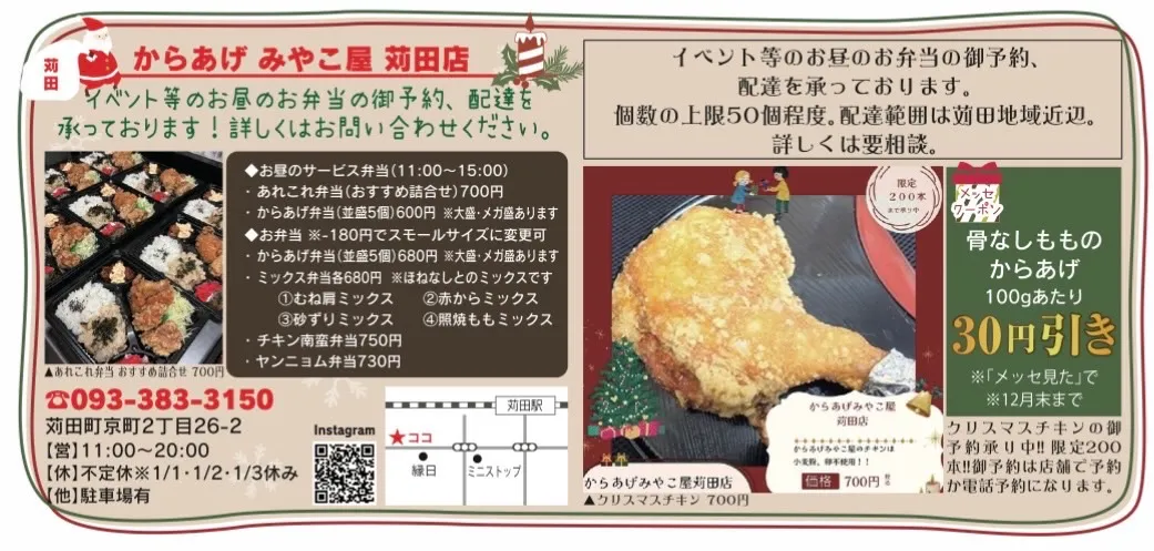 からあげみやこ屋苅田店です。メッセ行橋苅田版12月号のクリスマスコーナーに掲載させて頂きました!たくさんの方々の目に留まっていただけると嬉しいです😊今年も残すところ後1ヶ月!精一杯頑張っていきますので、よろしくお願い致します🤗