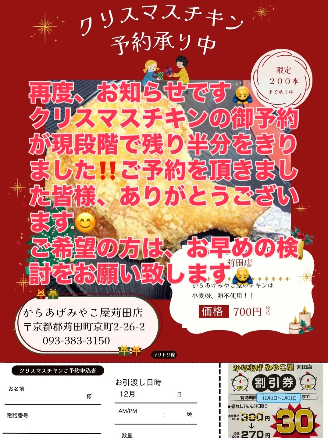 からあげみやこ屋苅田店です。早いもので、今年もあとわずかになりました!当店のクリスマスチキンも、たくさんの方々に助けられ、多くの御予約を頂いております🙇♂️予定の本数も残り半分をきりましたので、あらためてのご案内とお知らせをさせて頂きました!当店としましても、初めてのクリスマスです。心を込めて取り組んで参りますので、どうぞ宜しくお願い致します😊