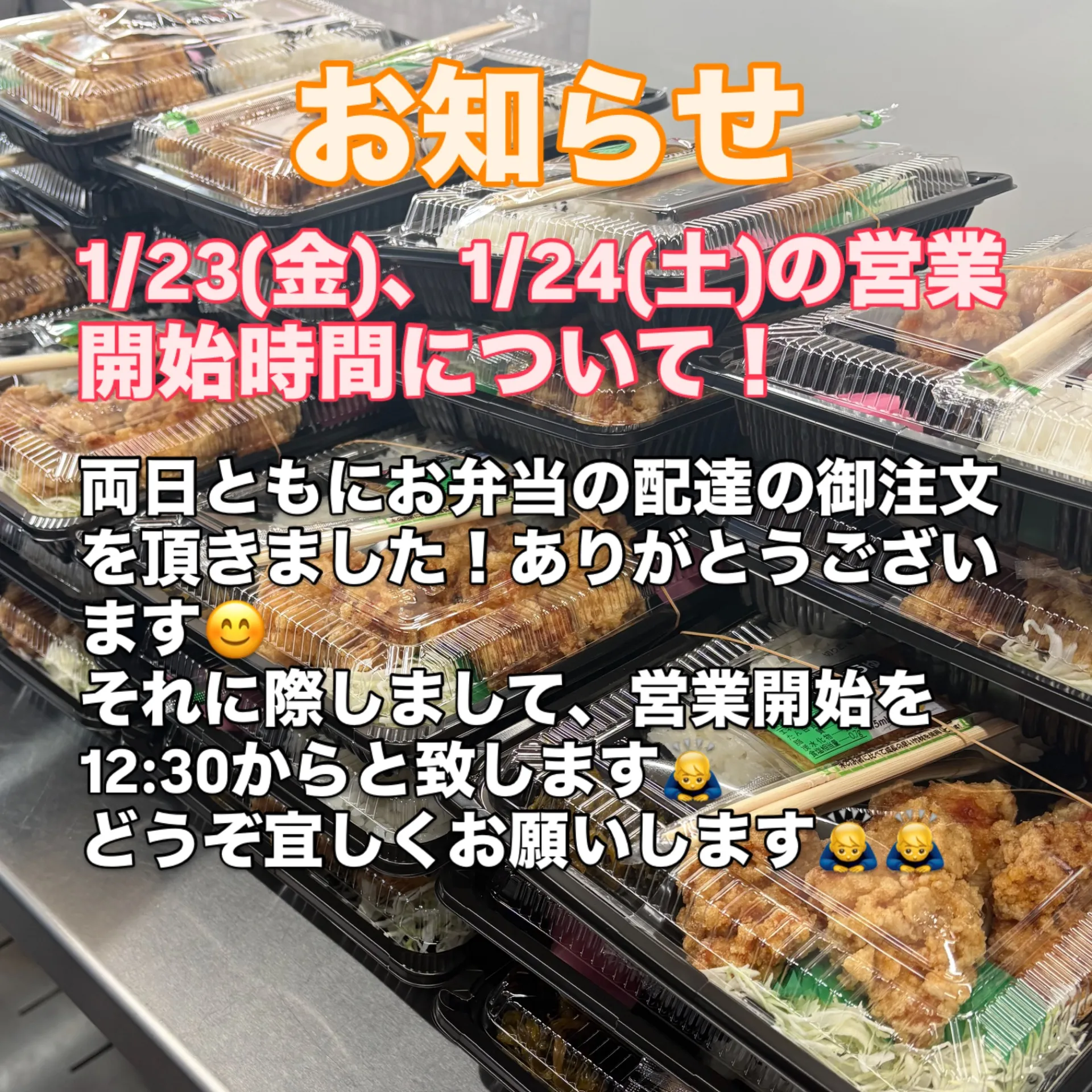 1/23、1/24の営業開始時間について 2026/01/23 からあげみやこ屋苅田店です!たくさんのお弁当の御注文を頂き、ありがとうございます🙇♂️ お昼のお弁当の配達に関しましては、事前のご予約をお願いしております!御希望の方は、是非ご相談ください😊